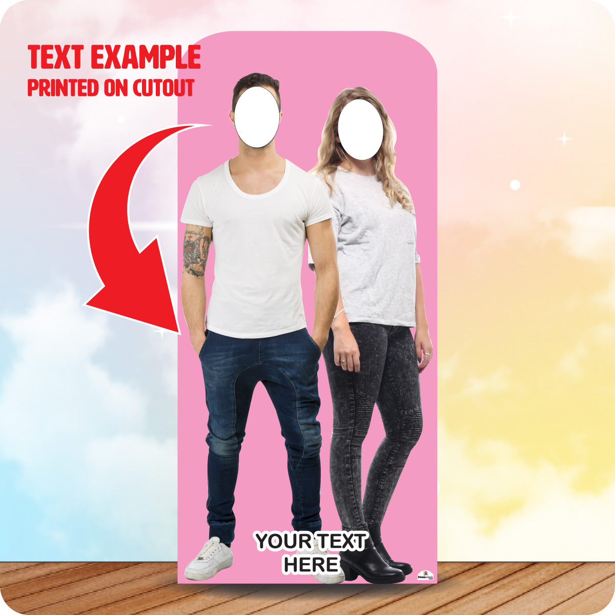 Cardboard cutout of a man and woman with Australian Made logo on pink background